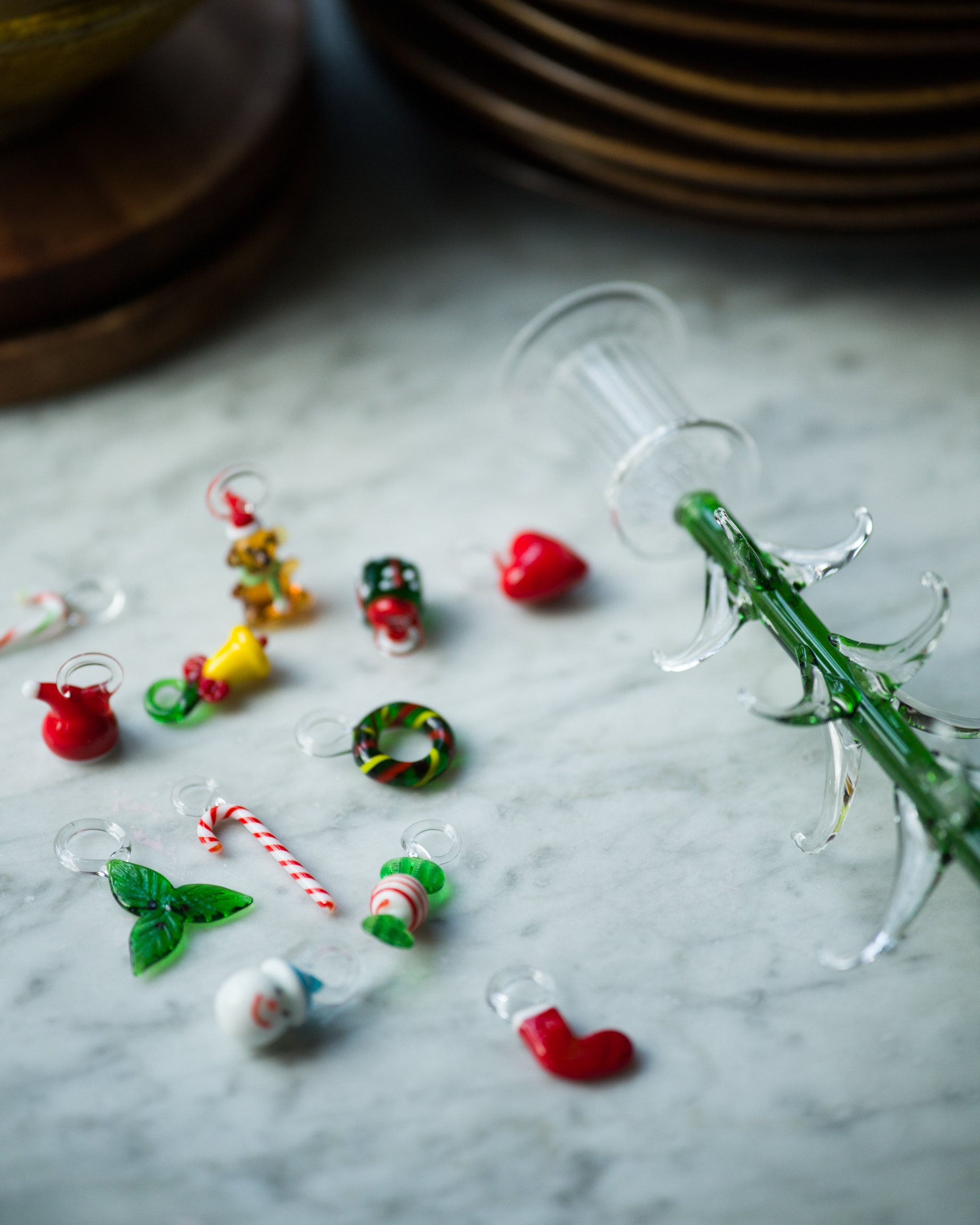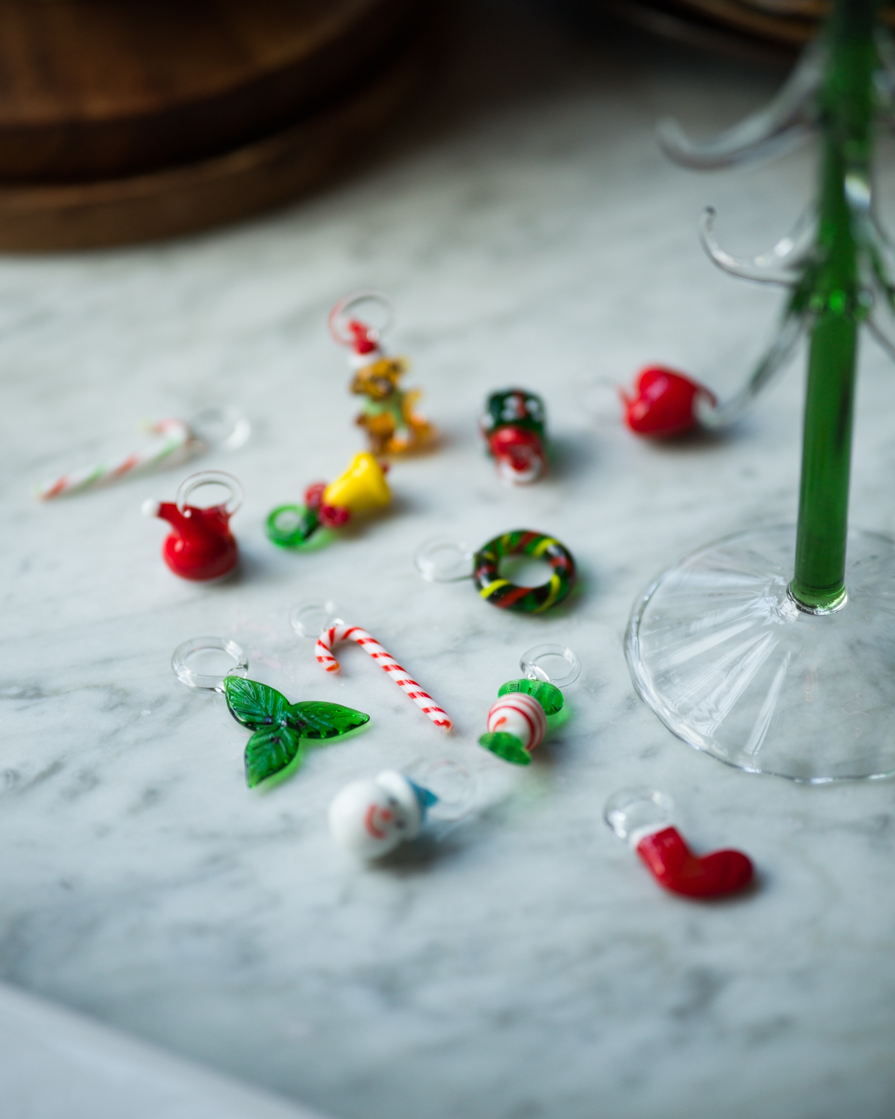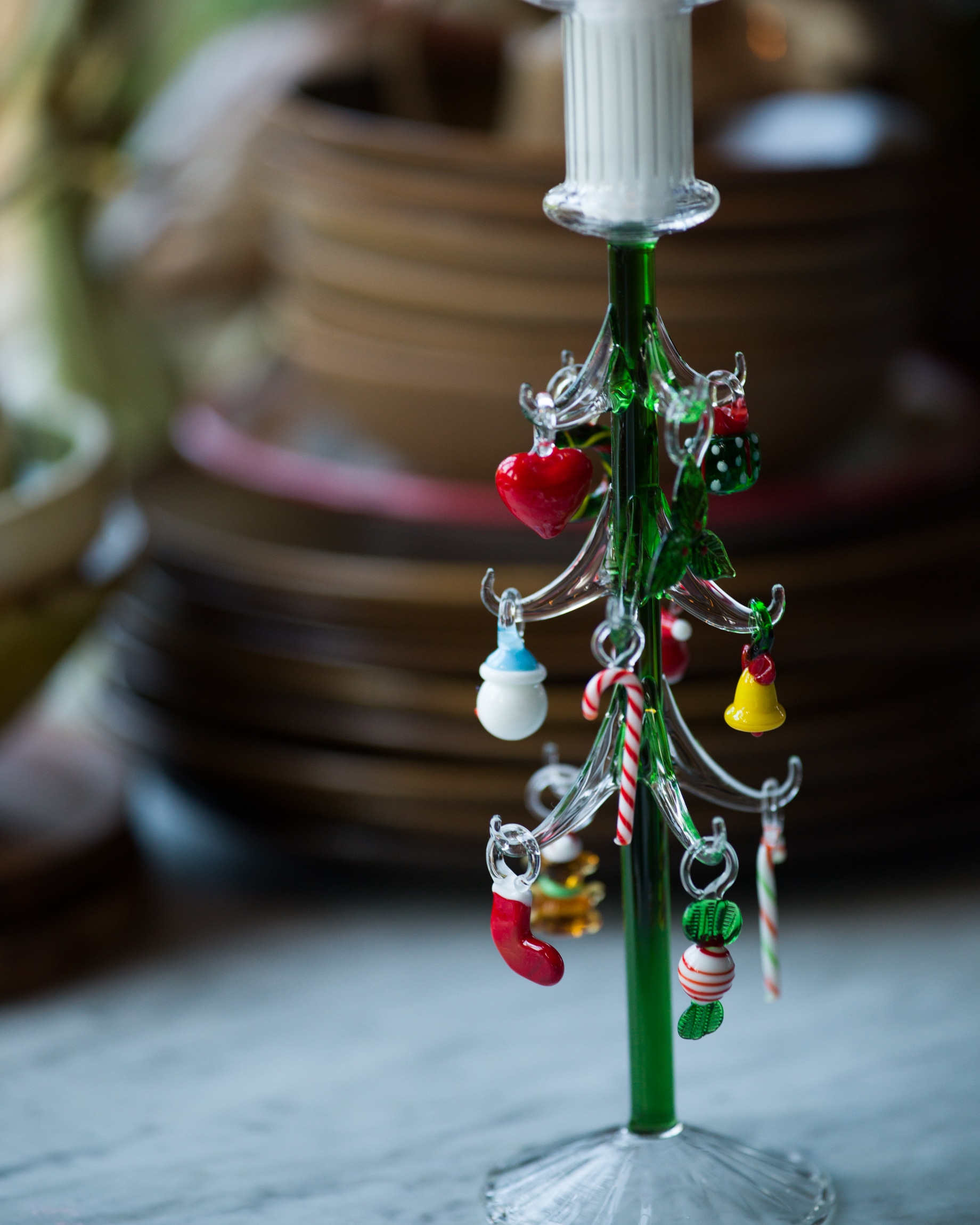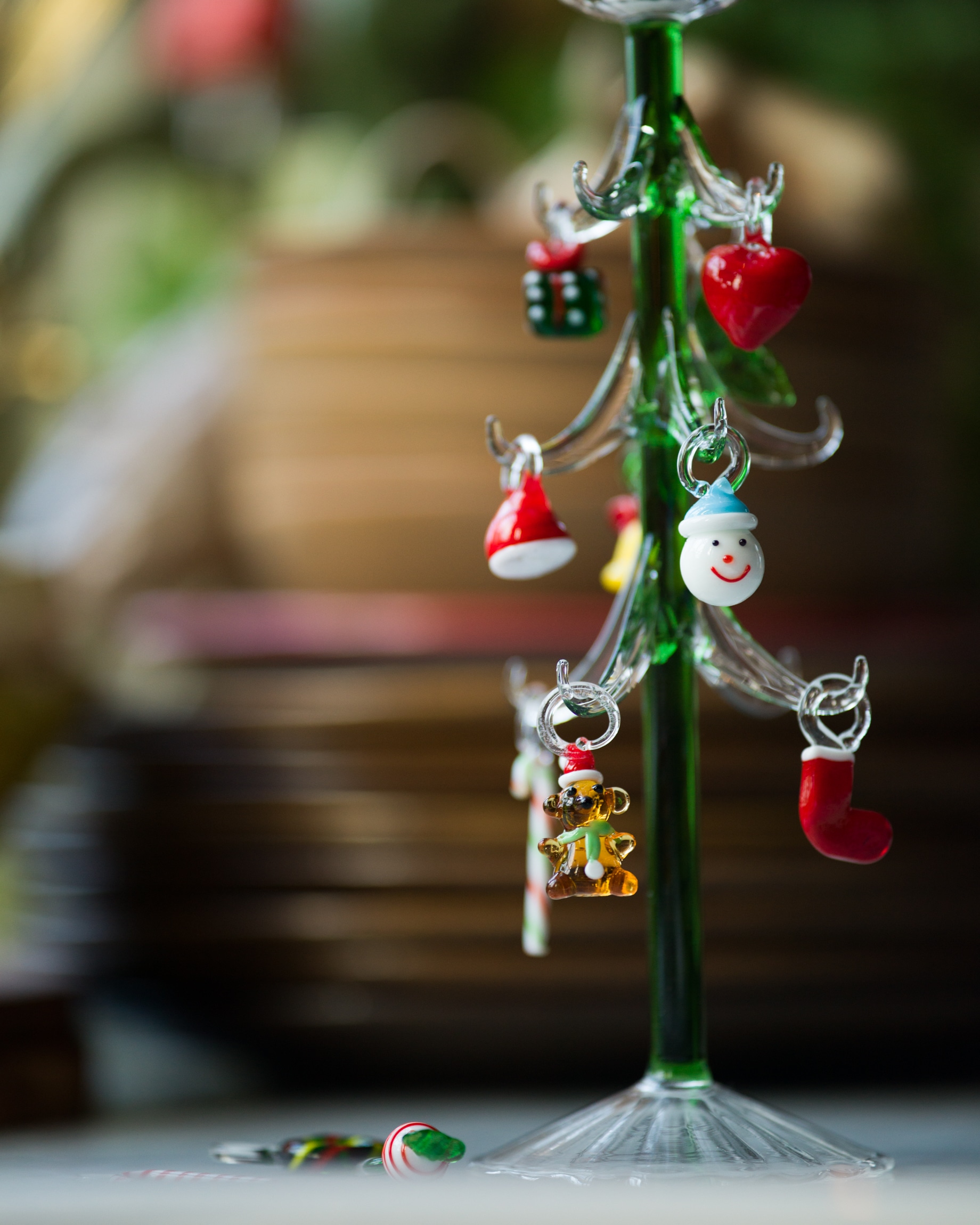 Det handblåsta glasträdet är gjort av tåligt borosilikatglas. Den gröna stammen med de klara grenarna bär upp små färgstarka julprydnader i glas. Polkakäppar, snögubbar, kransar och luva bland andra. Var och en handgjord med sitt eget uttryck.