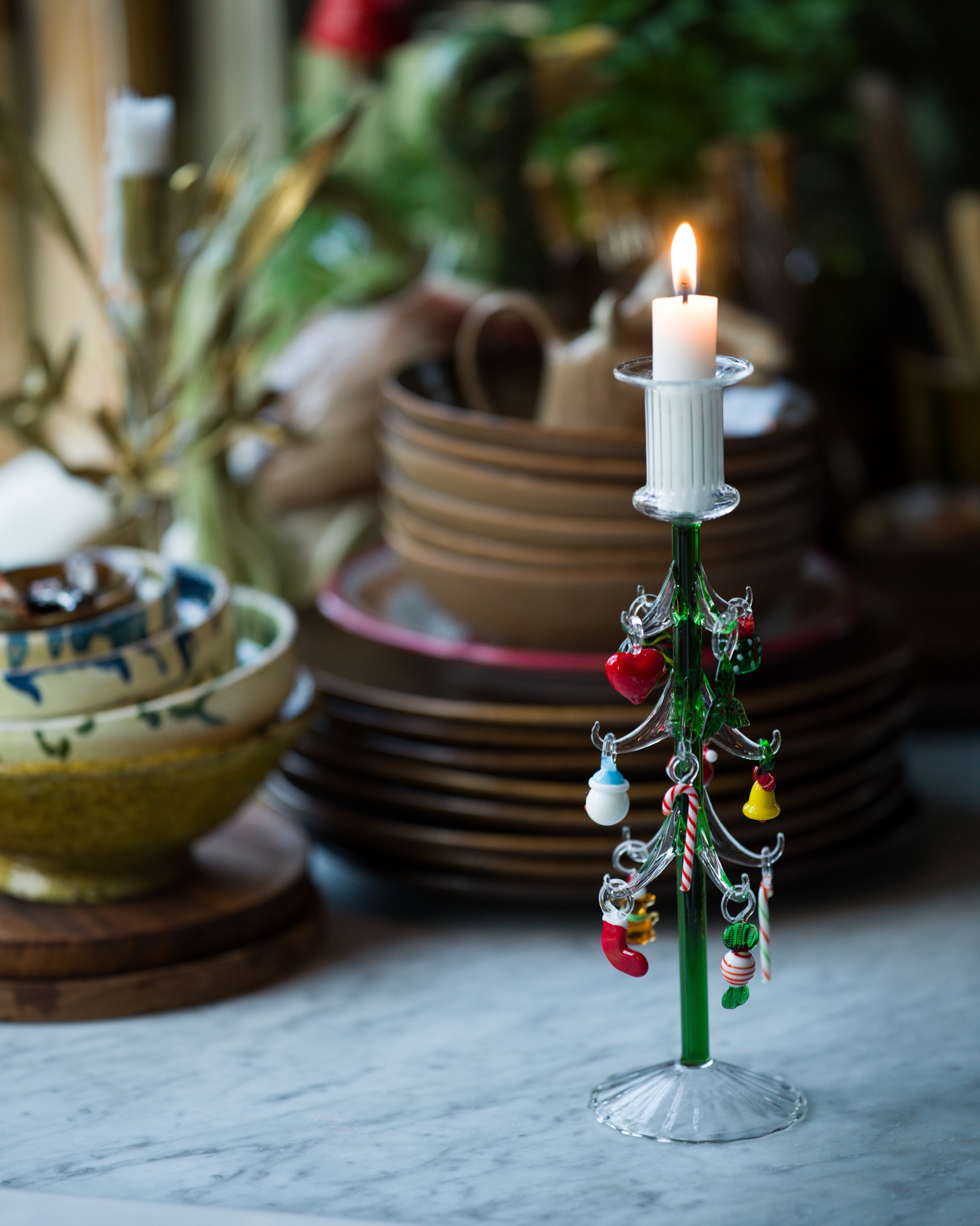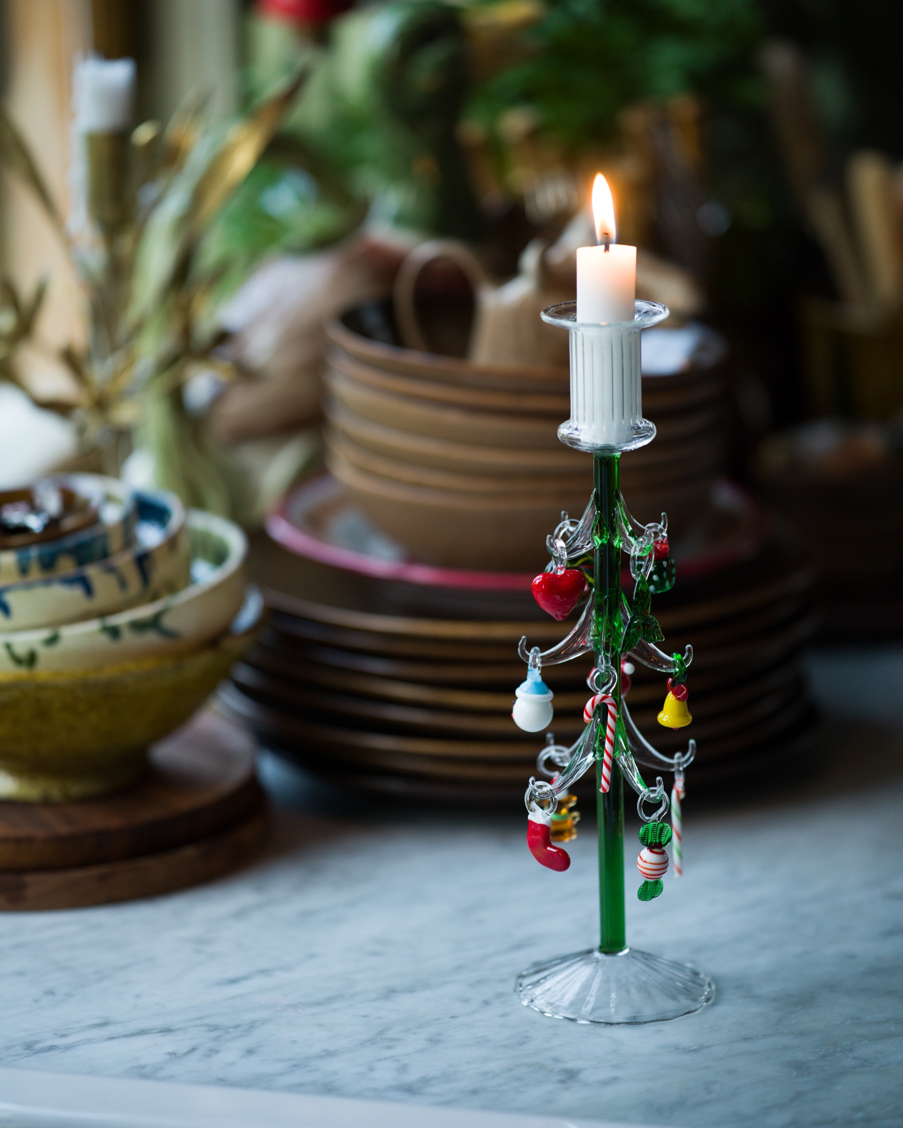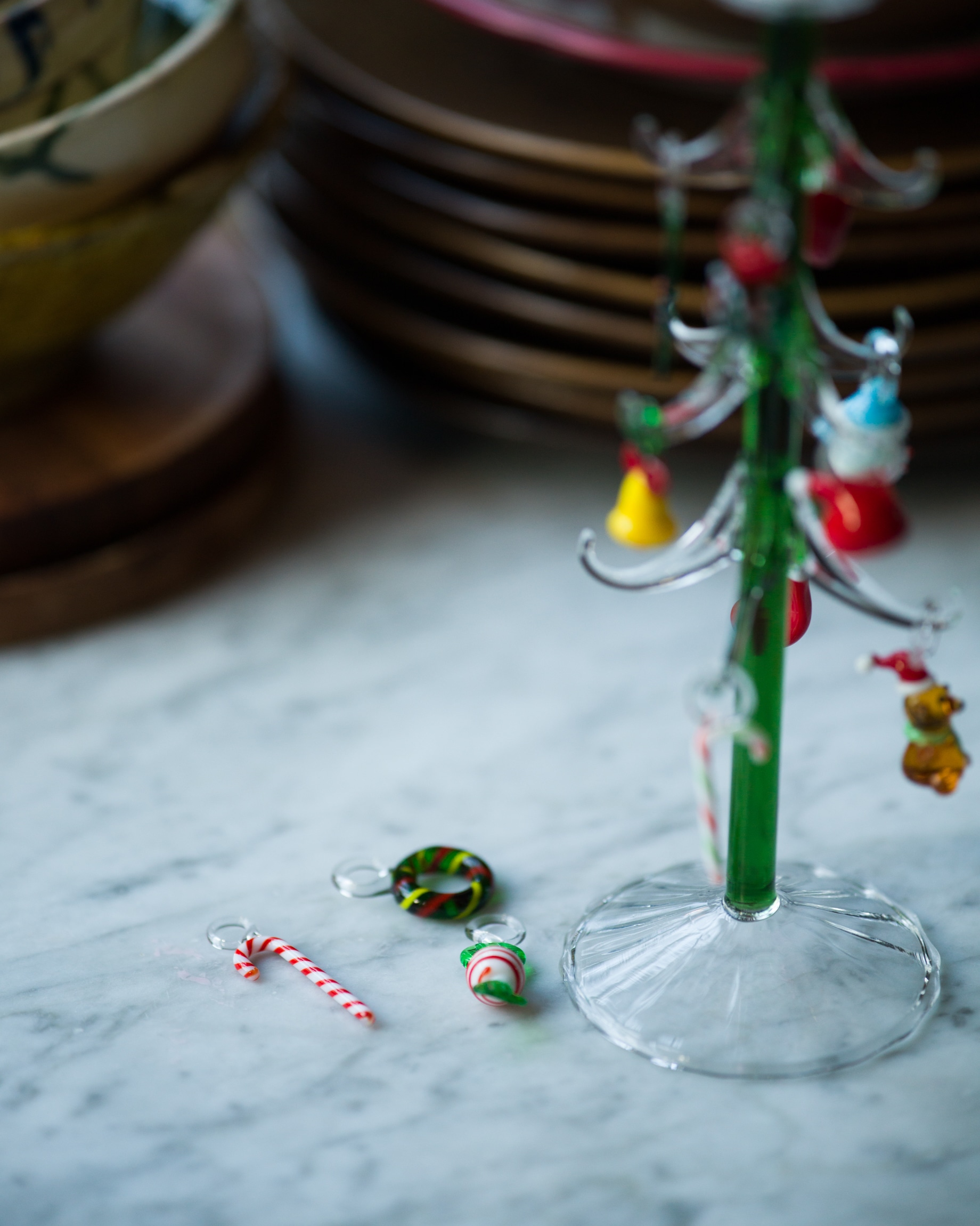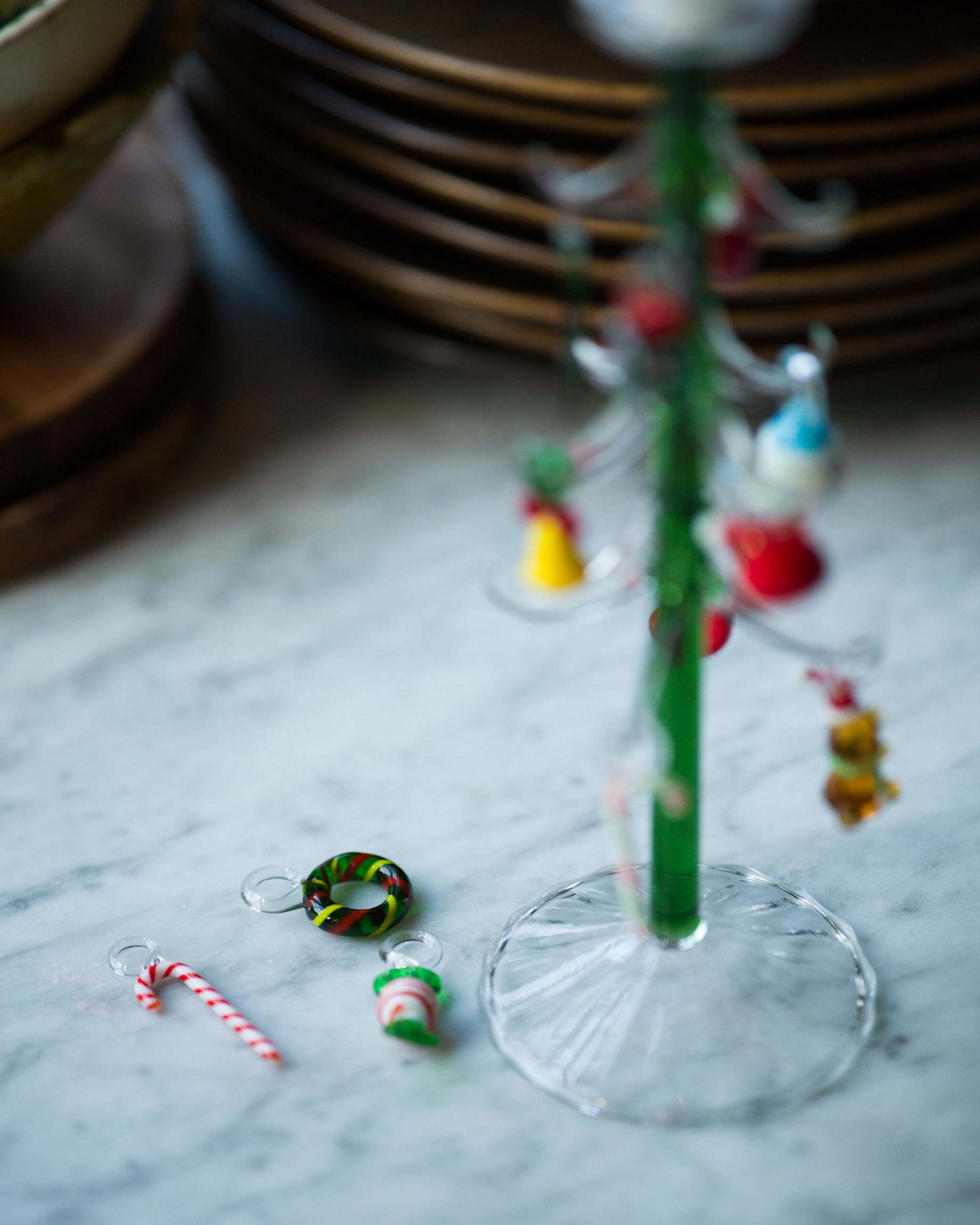 Det handblåsta glasträdet är gjort av tåligt borosilikatglas. Den gröna stammen med de klara grenarna bär upp små färgstarka julprydnader i glas. Polkakäppar, snögubbar, kransar och luva bland andra. Var och en handgjord med sitt eget uttryck.